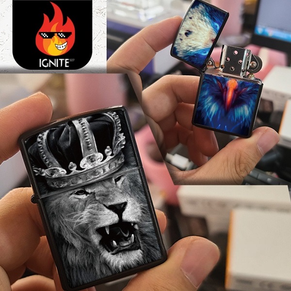 Diseño de león con rayos amarillos, simboliza poder y energía. Un encendedor único para los más audaces.